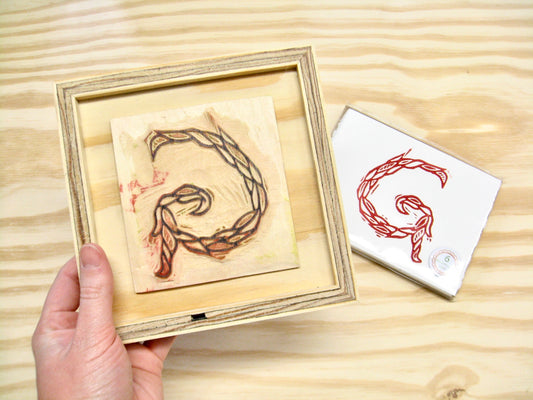 Letter G - hand carved original printers block with 6-pack monogram greeting cards - collector's item