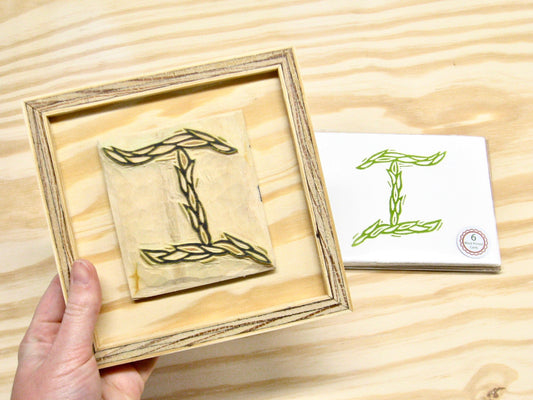 Letter I - hand carved original printers block with 6-pack monogram greeting cards - collector's item