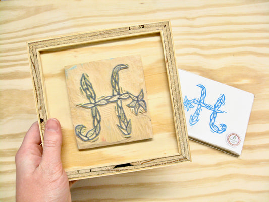 Letter H - hand carved original printers block with 6-pack monogram greeting cards - collector's item