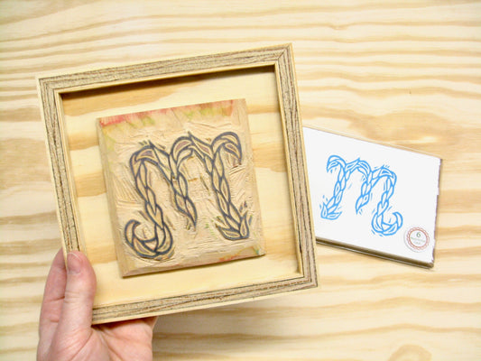 Letter M - hand carved original printers block with 6-pack monogram greeting cards - collector's item