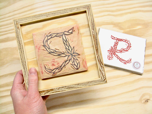Letter R - hand carved original printers block with 6-pack monogram greeting cards - collector's item