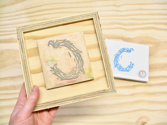 Letter C - hand carved original printers block with 6-pack monogram greeting cards- collector's item
