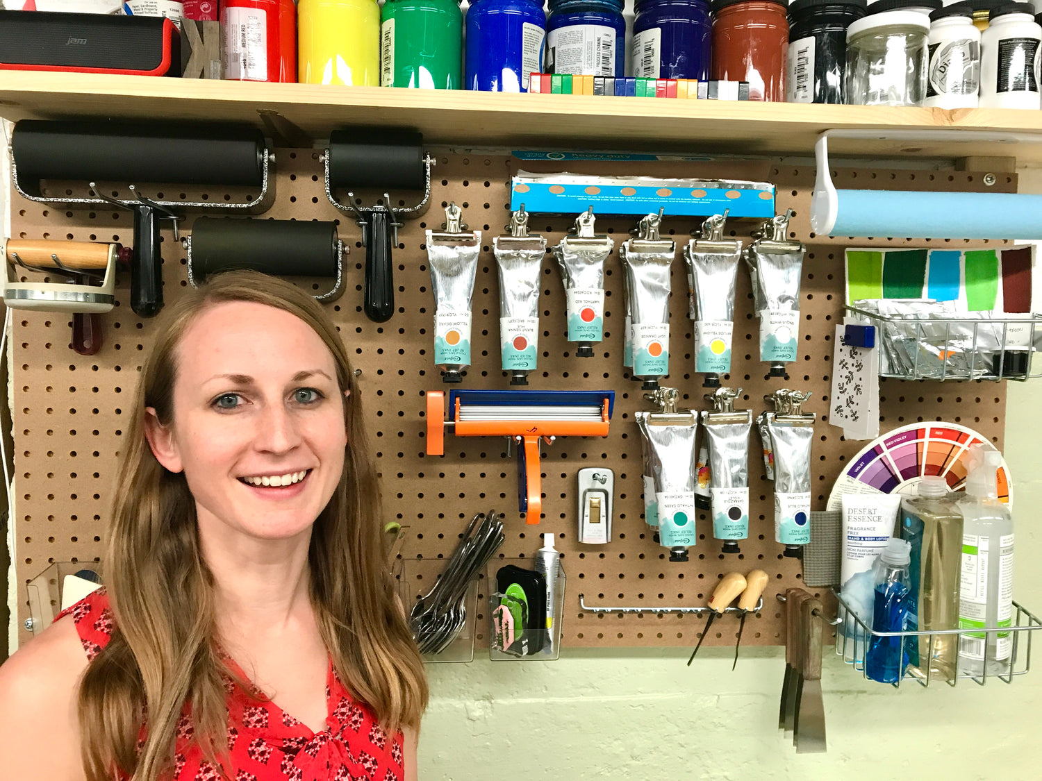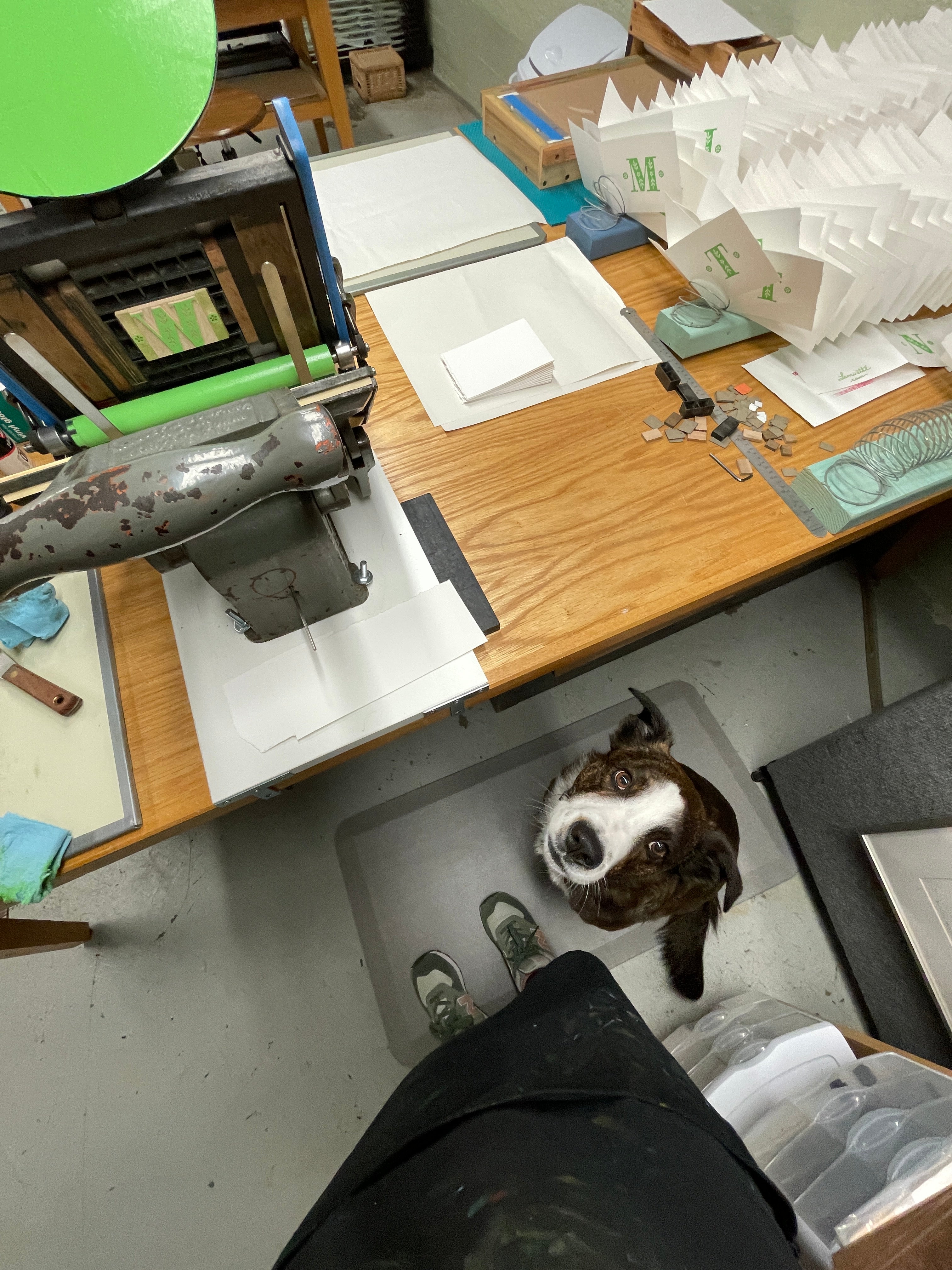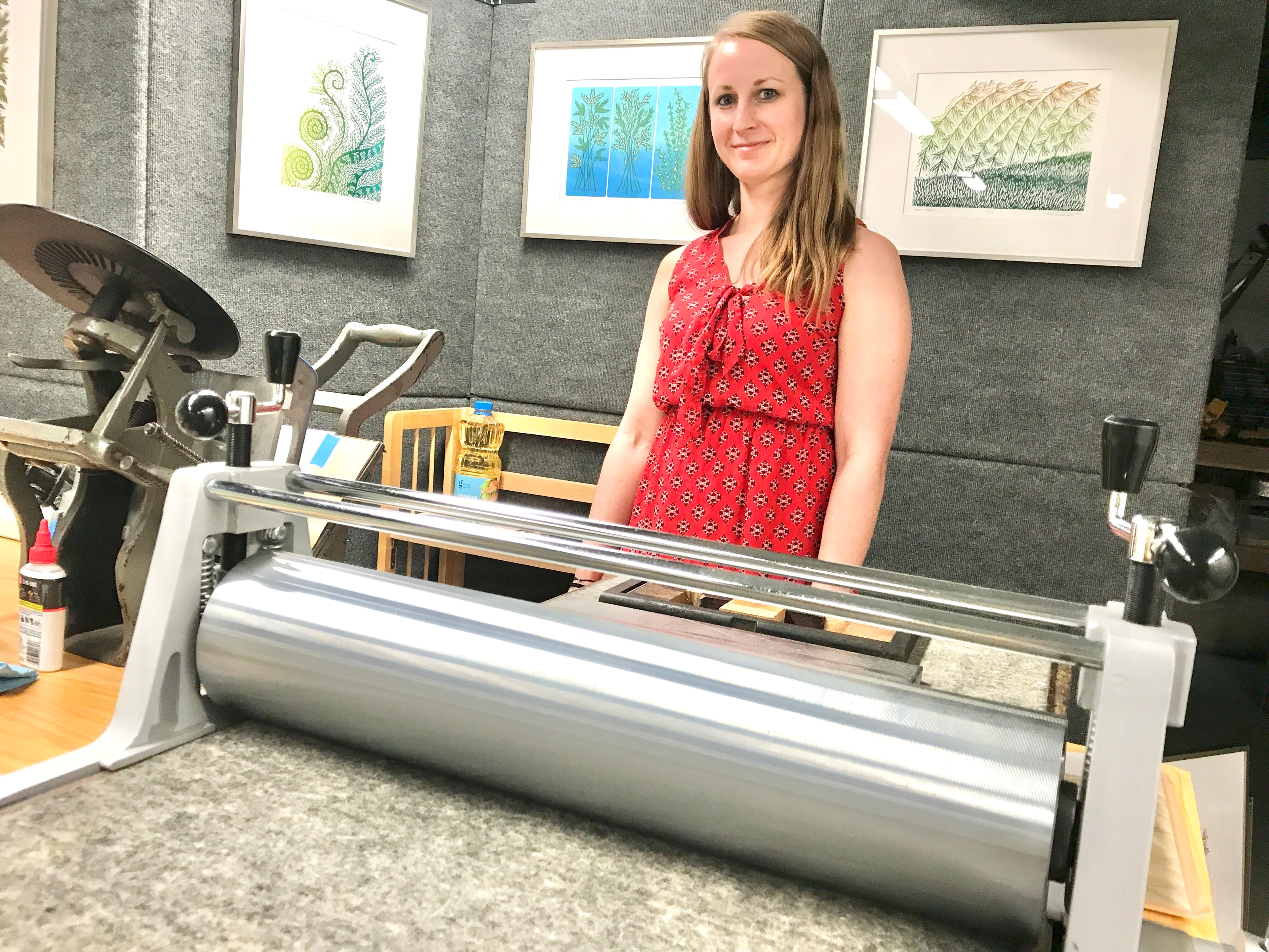 I graduated with a B.F.A. in Printmaking from Northern Illinois University in 2010 and have been a self-employed artist ever since. In the past I've printed my hand carved woodblock prints by hand or on an old Conrad Dickerson Machine Press out at my in-laws' farm - the location that inspired the name of my print shop. My new studio takes up a large portion of my basement at my home in Rockford, IL. I draw and carve all my woodblocks in the studio and print on three presses: a Provisional Press, a Kelsey 6x10" Excelsior letterpress, and a Jack Richeson relief press. My training in college did not even touch on letterpress so that has been an exciting new adventure since I bought my Kelsey letterpress in 2021. I love being able to incorporate the new press and wood type printing techniques into my current work.