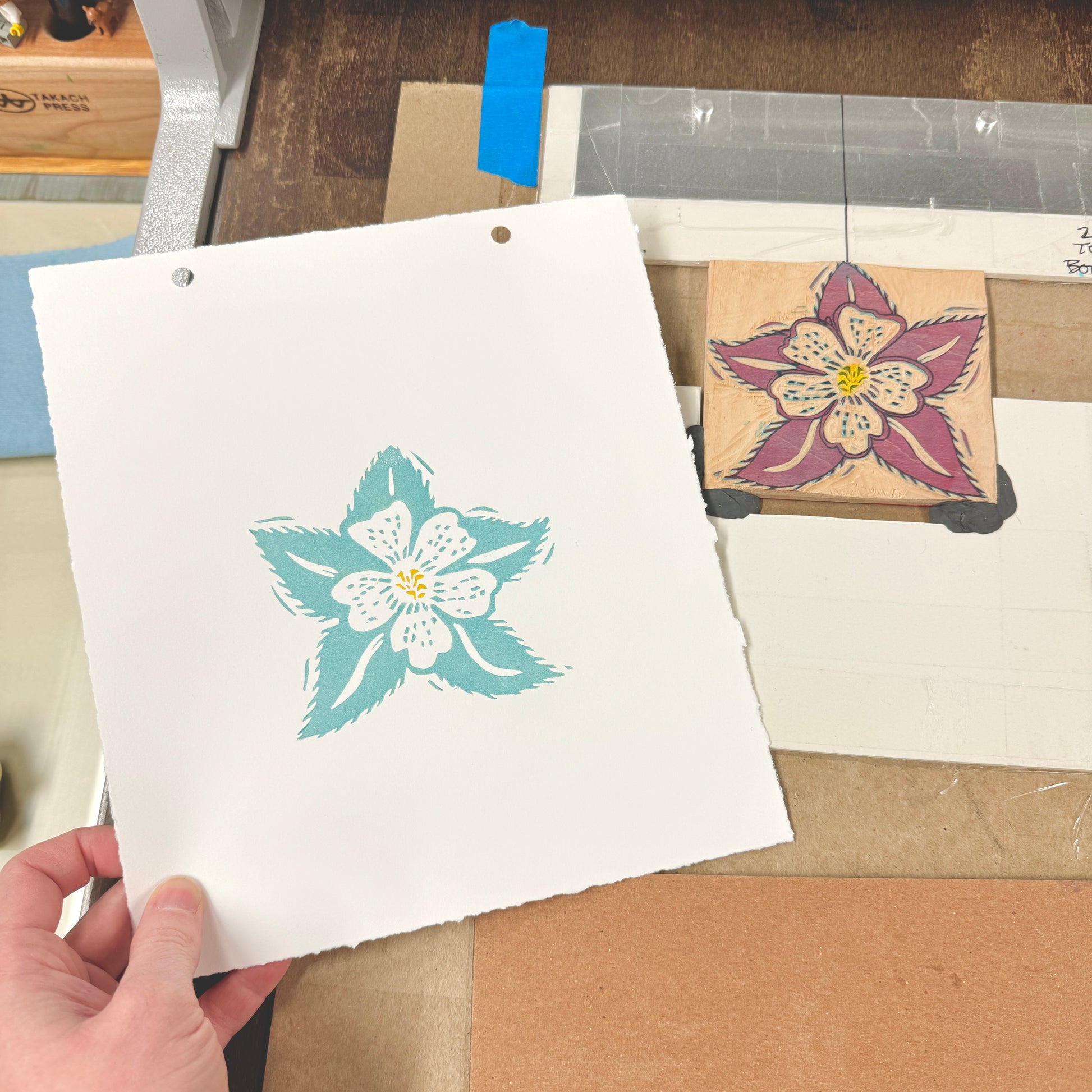 Printed on white thick cotton paper from one hand carved wood block with the reductive process. Yellow, dusty blue, purple, and blue green inks. Block sourced from a sustainable forest in Hokkaido, Japan. Title, artist signature, edition number, and year of production appear on front of each print. Each print is unique as they must be printed one at a time, reapplying ink to the block. Slight variations will occur.