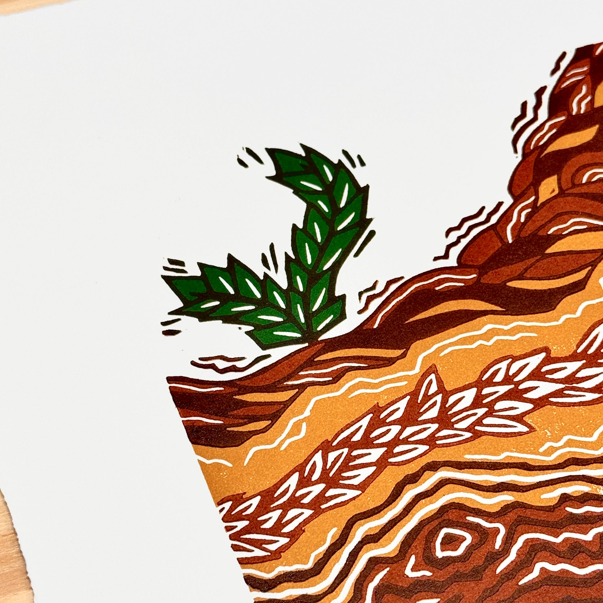 Printed on white thick cotton paper with three layers of earthy orange, light and dark brown, and forest green inks. Printed reductively from one hand carved woodblock sourced from a sustainable forest in Hokkaido, Japan. Title, artist signature, edition number, and year of production appear on front of each print and on the back of each frame. Each print is unique as they must be printed one at a time, reapplying ink to the block. Slight variations will occur.