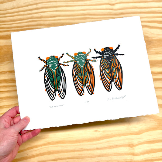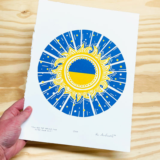 You Are the Yellow Sun in the Blue Sky - Brovary, Ukraine Fundraiser woodblock print (9x12")