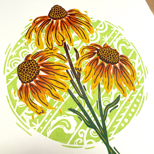 These Are For You - Black Eyed Susan Flowers - woodblock print (9x12")