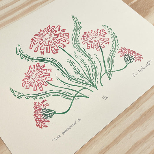 Pink Dandelion GHOST PRINT - woodblock print (9x12")