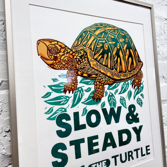 Slow & Steady Goes the Turtle FRAMED - woodblock and letterpress print (16x20")