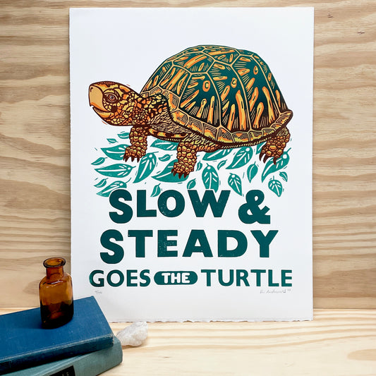 Slow & Steady Goes the Turtle - woodblock and letterpress print (14x18")