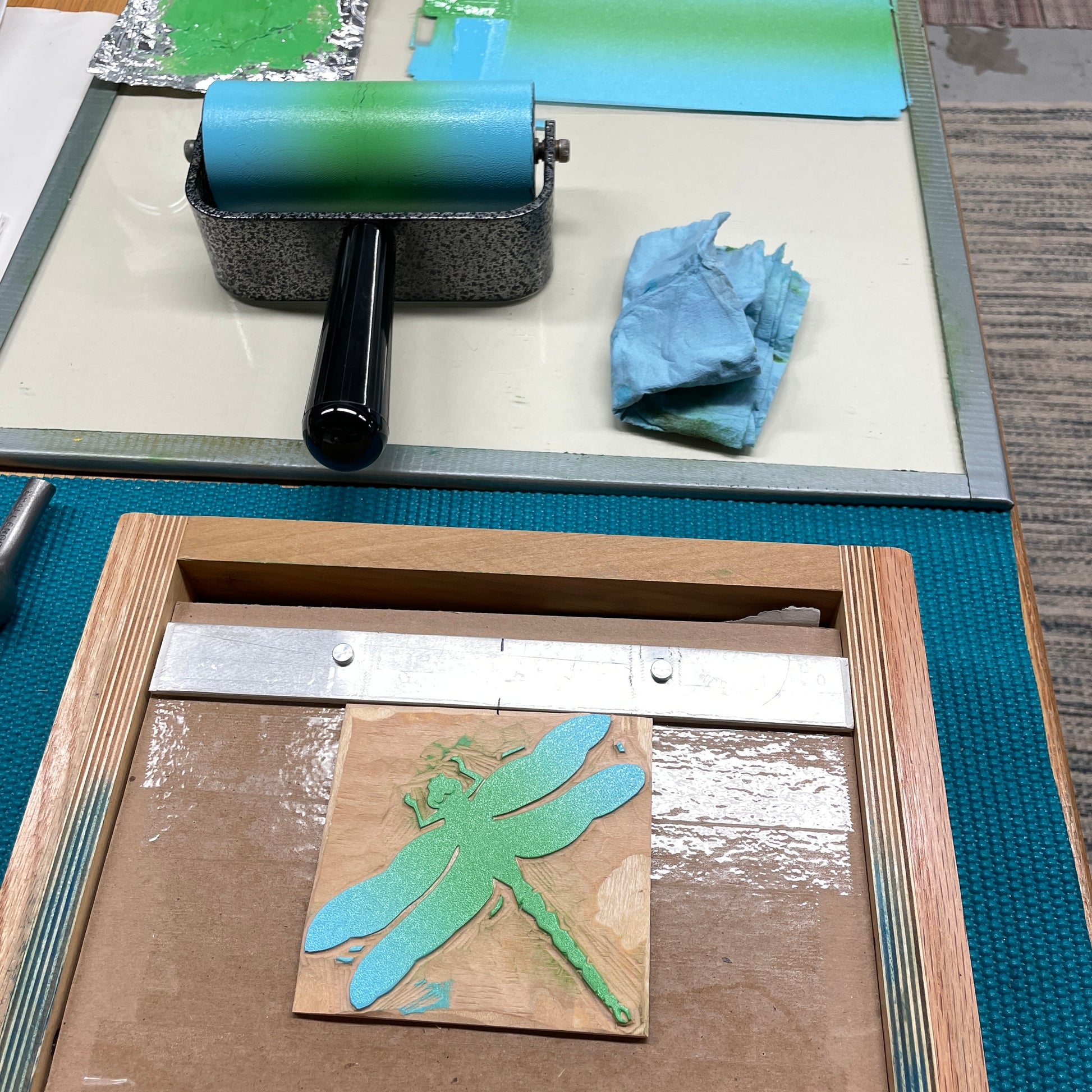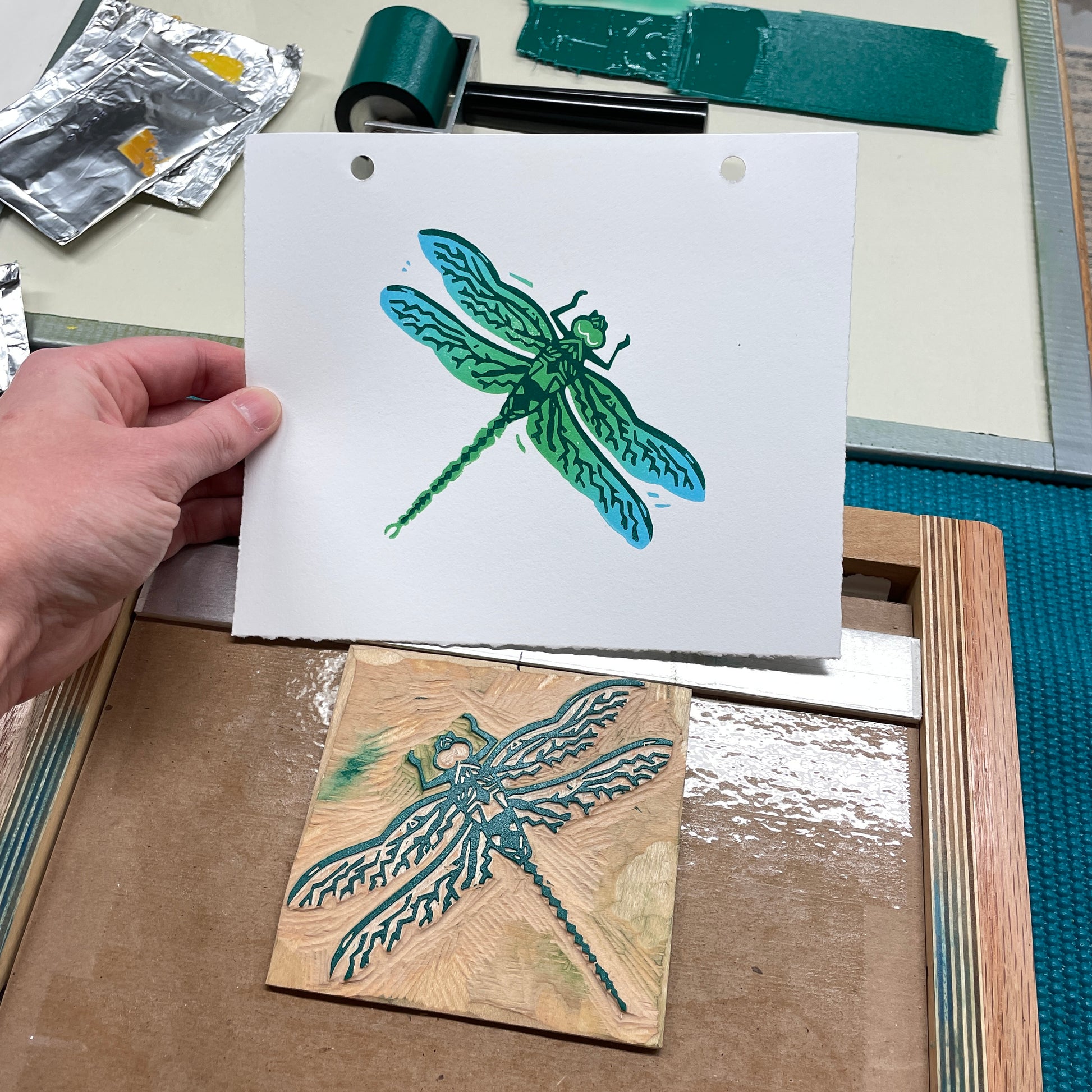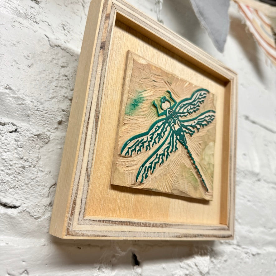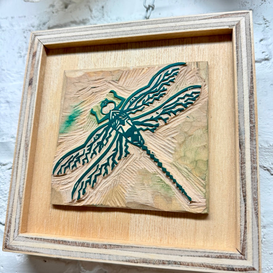 This woodblock is the exact block that I hand carved for my "Green Darner" dragonfly print. Artist marks, carvings, and ink all appear on block. Displayed in a wood frame created by me and my husband.