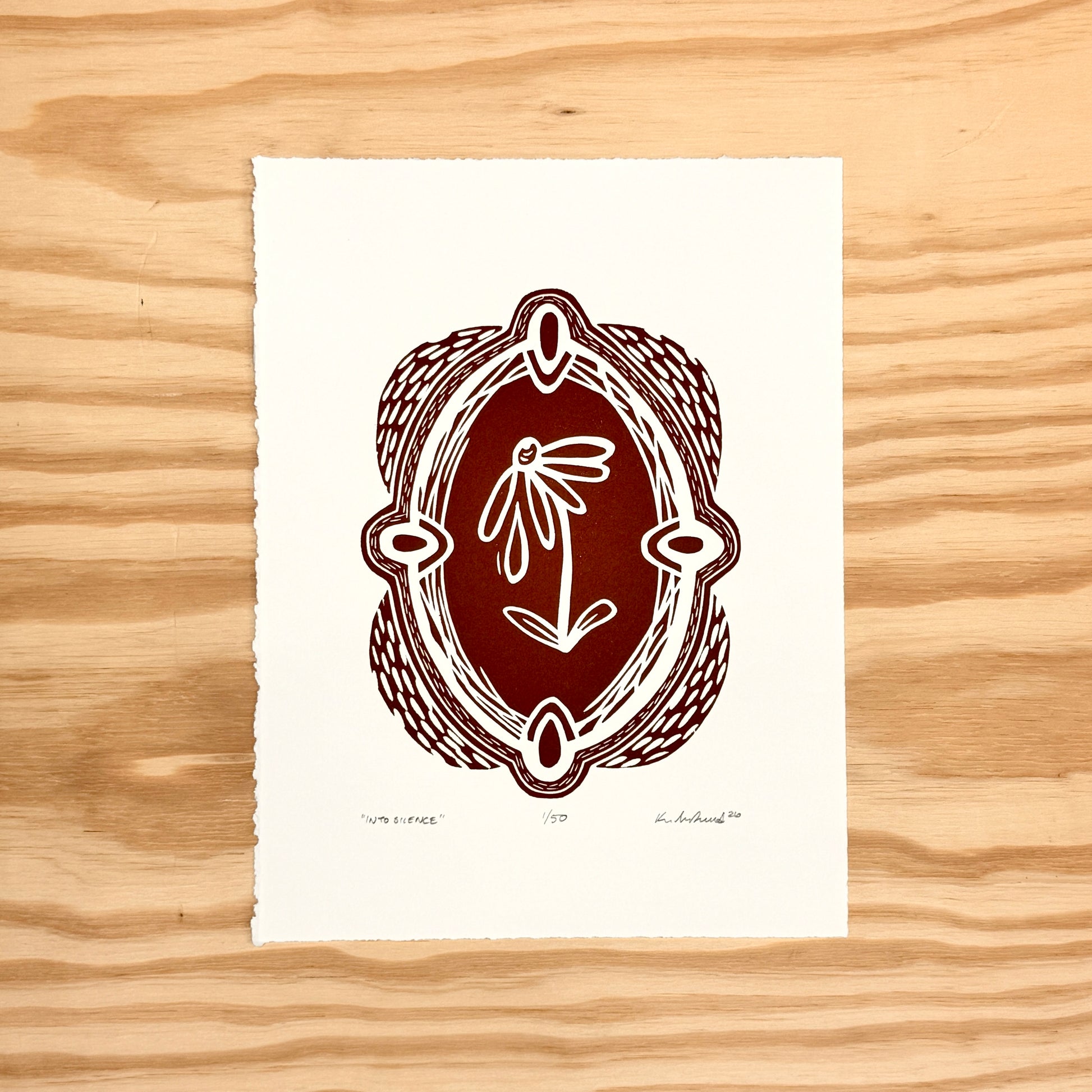 Printed on white thick cotton paper with maroon red ink. Printed from one hand carved woodblock sourced from a sustainable forest in Hokkaido, Japan. Title, artist signature, edition number, and year of production appear on front of each print. Each print is unique as they must be printed one at a time, reapplying ink to the block. Slight variations will occur.